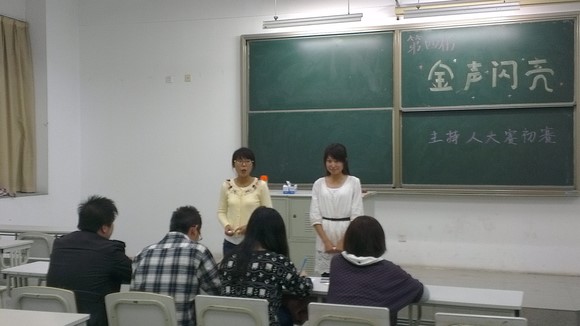 经过前期的宣传,共有50位同学参加此次初赛的选拔。选手在201教室进行签到及随即分组,并在工作人员处抽取题目。比赛正式开始于六点半,每组选手依次上场,整个流程分为自我介绍,搭档主持及评委提问,每组选手经过五分钟的准备,表现自然、大方,充分展示了自己的风格。