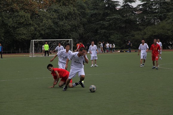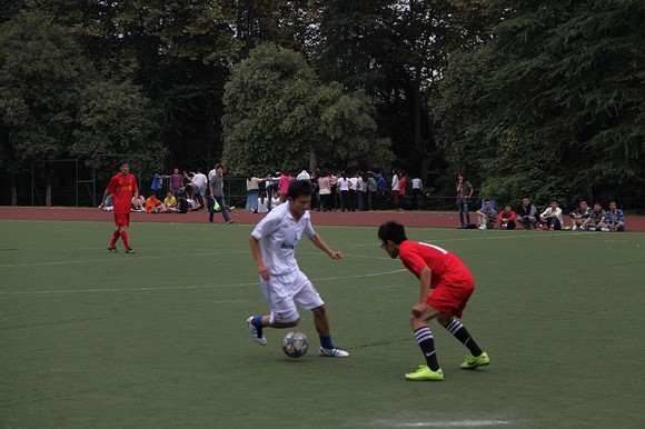 我院运动员一反红色常态,穿着白色球服在绿茵场上尽情奔跑,肆意挥洒汗水。