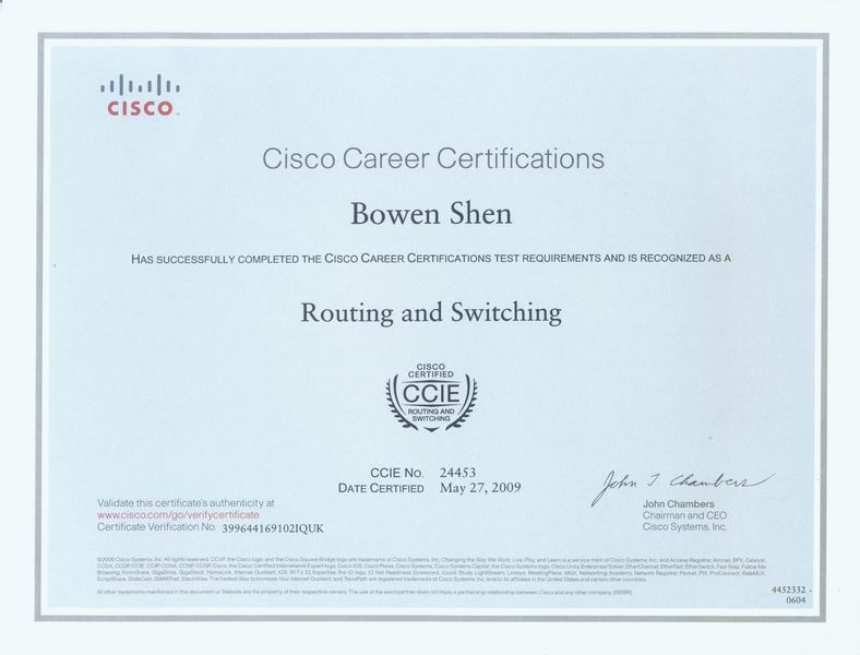 沈博文同学在CCIE的学习历程中,并没有放松自己的在校学习。2008年,他荣获全国大学生数学建模竞赛全国二等奖;2009年,他又顺利通过全国大学生计算机四级考试,获得网络工程师称号。