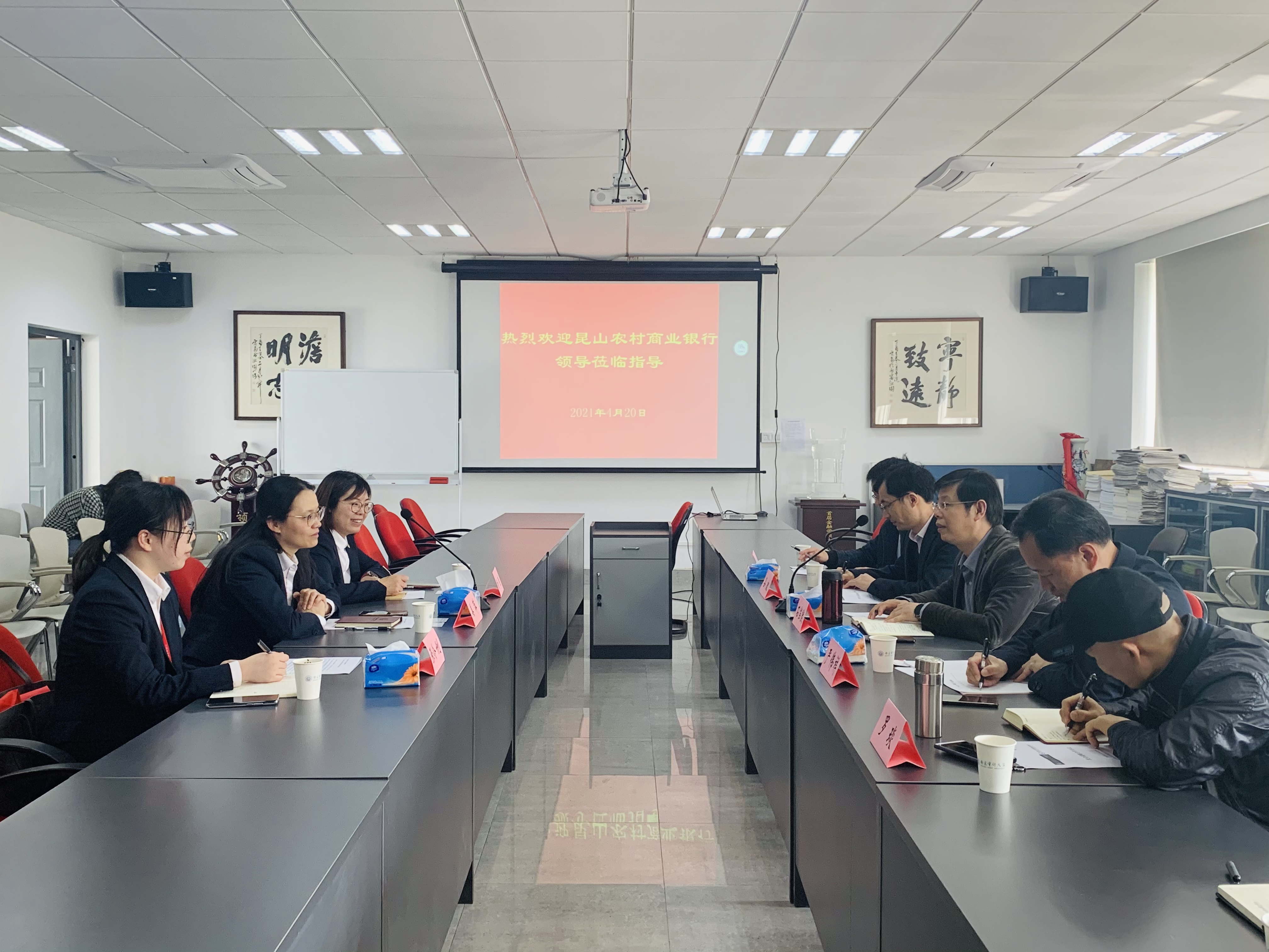 4月20日下午,昆山农商银行人力资源部总经理姜萍、人力资源部总经理助理杨艳、招聘主管张伶俐一行三人来访high漫画 。学院院长石岿然、副院长谷政、各系主任在敏达楼516会议室与姜萍总经理一行进行座谈交流。