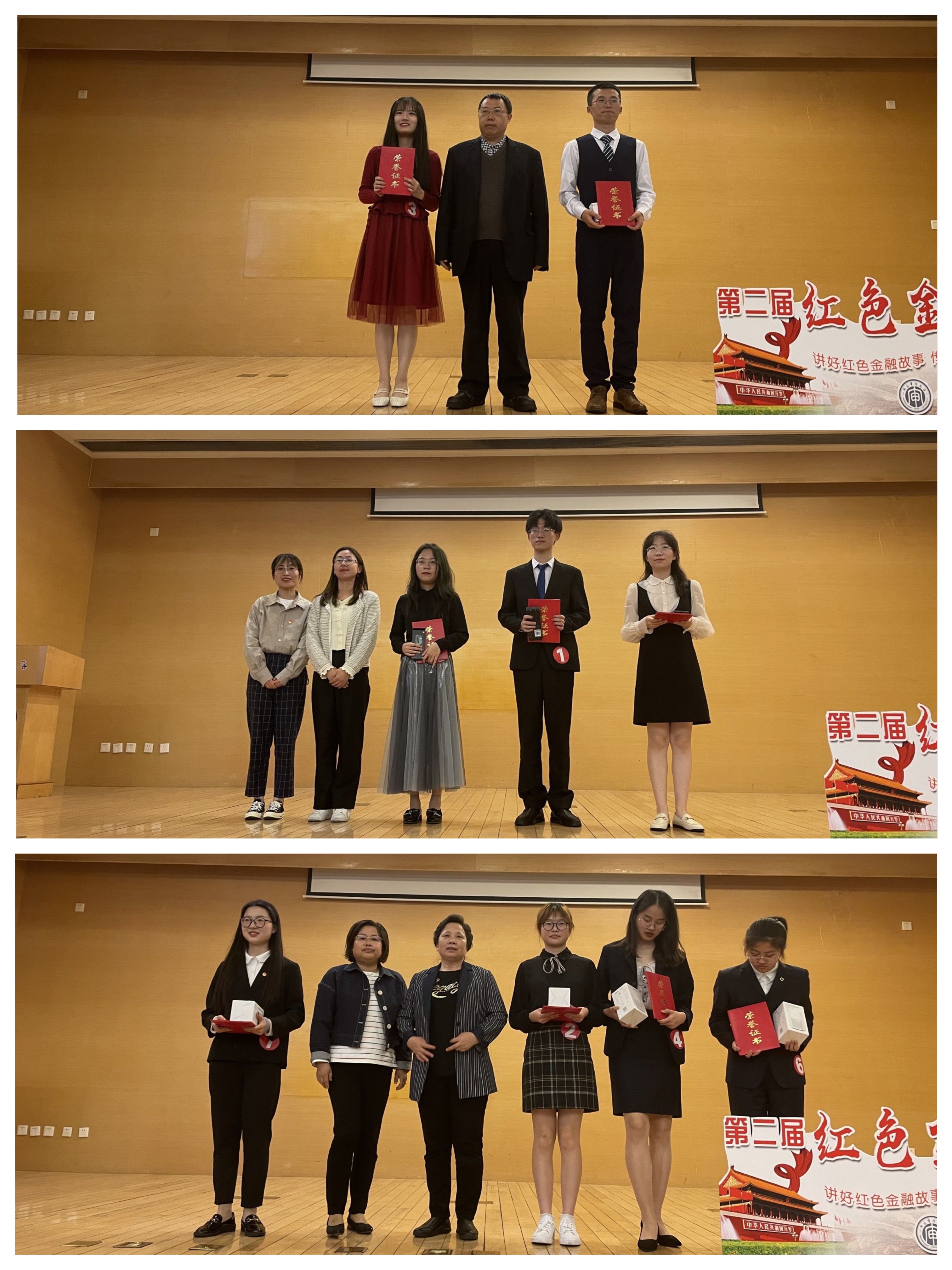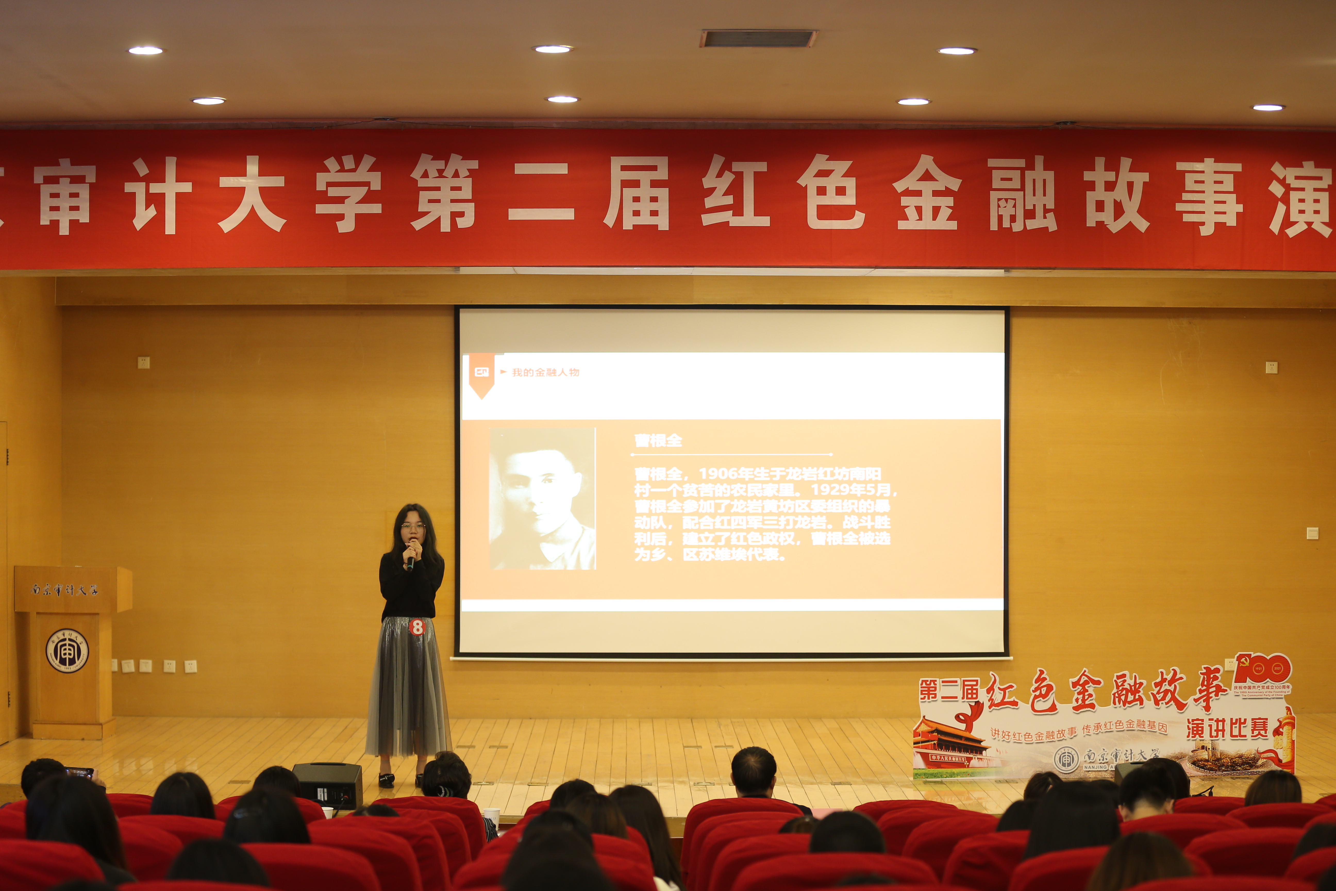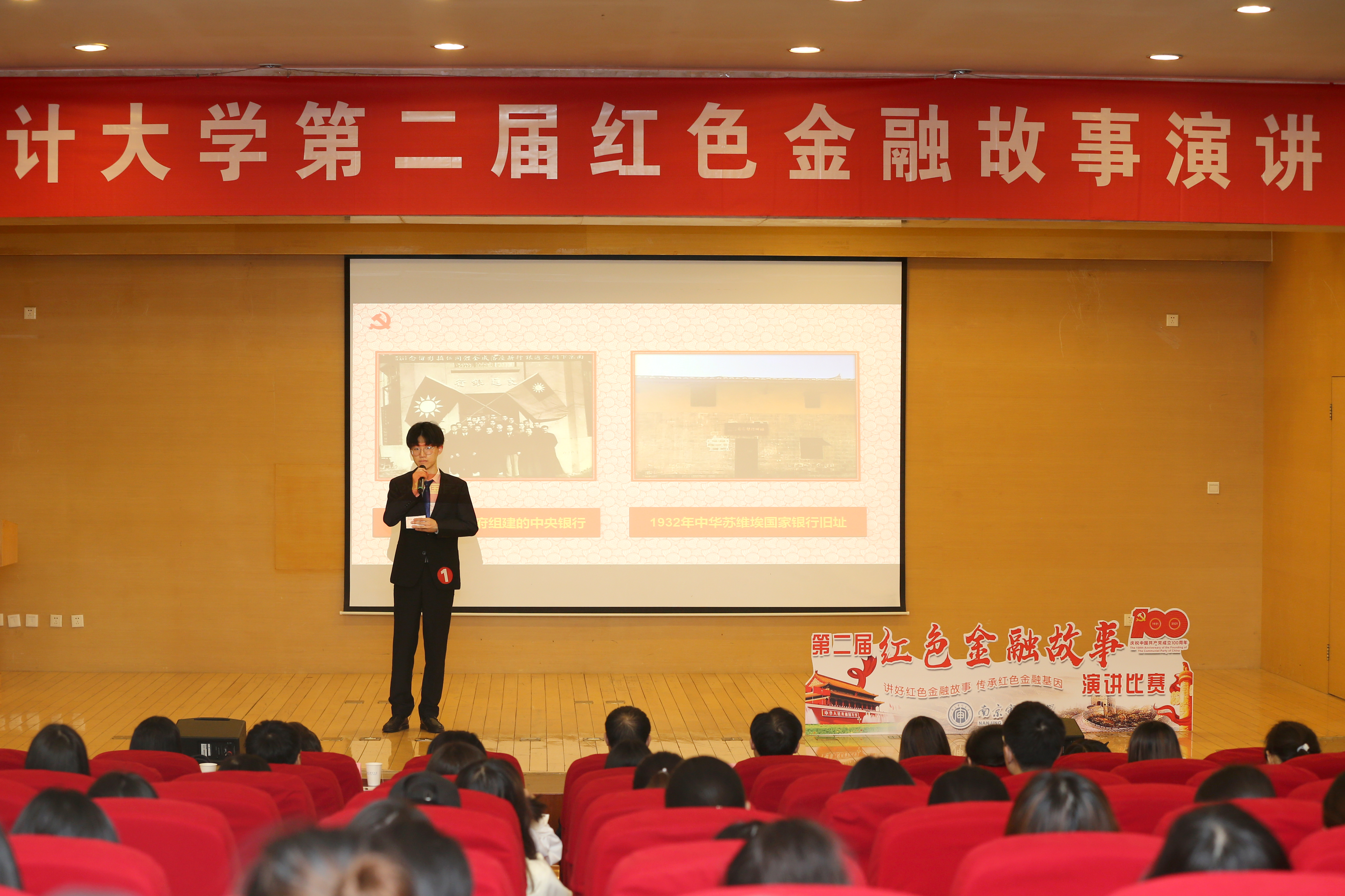 比赛中,各位选手怀着对革命前辈们无比崇敬的心情,饱含激情地讲述了一个个为国家富强、人民幸福而艰苦奋斗、甘于奉献、勇于牺牲、可歌可泣的金融英雄故事。井天祥同学分享了“红色大管家”毛泽民短暂却精彩的一生,尤其是毛泽民作为国家银行行长,在革命时期是如何让新生的国家银行正常运转,让百废待兴的经济得到发展的;孙悦同学讲述了一代侨领庄世平老先生在抗日时期,在新中国成立后为中国、为香港经济发展做出巨大贡献的传奇人生;杜春婷同学以打动人心的演讲技巧和得体的形象风度讲述了高捷成舍己为国的高尚事迹,她铿锵有力地念出那封“迟到六年的家书”让在场的观众无不动容、潸然泪下;万自立同学了讲述了井冈山红军造币厂的建立与“工”字银元铸造的故事,回顾了当时国内外的货币历史,呼吁大家传承井冈山精神,让井冈山精神在新时代折射出新的光芒;刘铭同学分享了红色审计第一人阮啸仙的英雄故事,讲述了他成长为中华苏维埃共和国第一位中央审计委员会主任,用专业知识为苏区经济建设贡献力量的事迹;蒋政延同学讲述了为抗美援朝胜利和新中国成立之初经济发展做出巨大贡献的霍英东先生的幕后英雄事迹;李娟同学分享了在解放战争的炮火中,按中共中央指示,担当重任创建中国人民银行,并亲自为第一套人民币书写货币名的董必武事迹;曹诗文同学讲述了“扁担上的国家银行”时期重要人物曹根全;高云硕同学讲述了以一己之力改变边区经济局势,让边境金融繁荣稳定的朱理治先生的事迹……选手们通过慷慨激昂的演说,将一个个红色金融故事娓娓道来,带领大家学习金融史,重温激情燃烧的红色岁月。在场的评委和观众们无不深深感动。