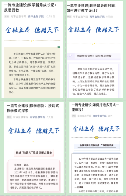 为积极推进学院一流专业建设,提升学院教师授课水平,我院近期在官微进行了一系列专题推送,主题分别为:“教学新秀成长记:反思促教”“教学督导面对面:如何进行教学设计?”“教学创新:浸润式教学模式探索”和“如何打造多范式一流课程?”。通过青年教师们的教学心得与反思总结、学院督导对于教学设计的心得与示范、优秀教师郭岚的浸润式教学模式的探索、“证券投资学”多范式新生态一流课程的引领,进一步推动学院第一课堂改革,达到了反思促教、示范促教的良好效果。