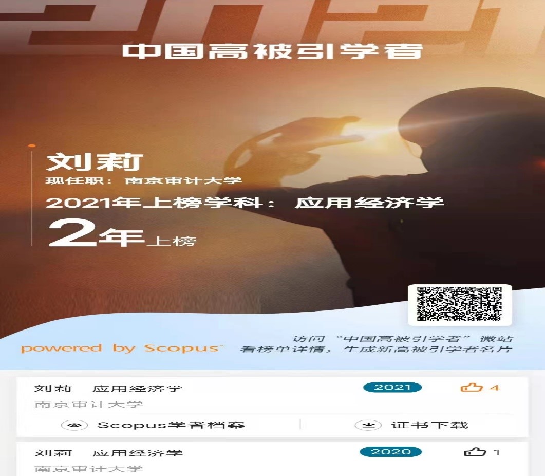 2022年4月14日,全球性信息分析公司爱思唯尔(Elsevier)重磅发布2021“中国高被引学者”(Highly Cited Chinese Researchers)榜单,high漫画 刘莉副教授作为应用经济学学科的高被引学者入选该榜单。