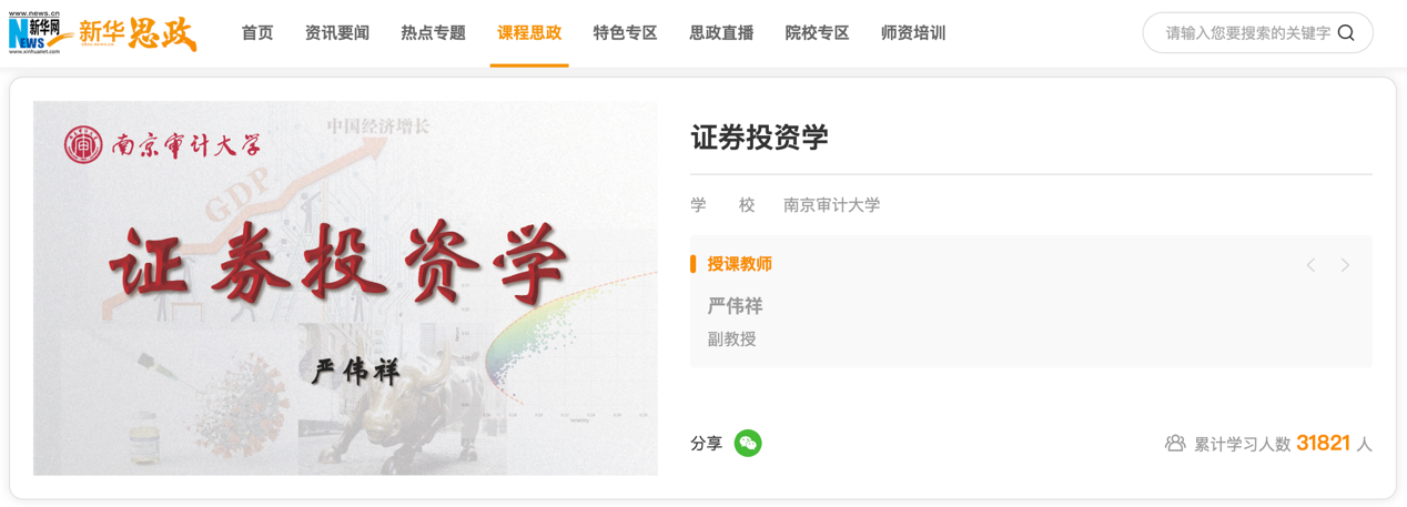 近年来,投资学系党支部“党建+课程思政”育人效果明显、成果丰硕。先后获国家级一流本科专业建设点、首批国家级一流本科课程(投资学)、江苏省首批一流本科课程(证券投资学)等省级及以上课程建设成果。2021年“证券投资学”课程在新华思政平台上线,累计学习人数超过3万人,在金融学类课程中排名第一。