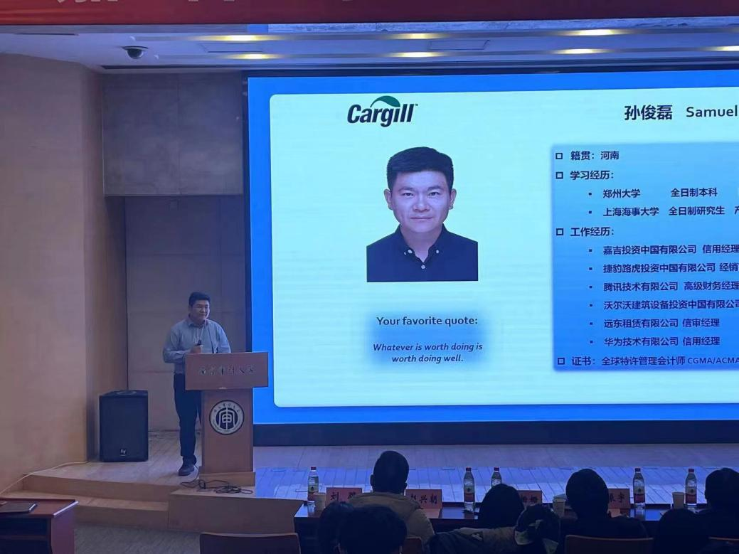 颁奖环节,嘉吉方和学院教师对获奖学生进行表彰。颁奖典礼后,孙俊磊分享嘉吉CTC信用管理经验,并和现场同学交流互动。