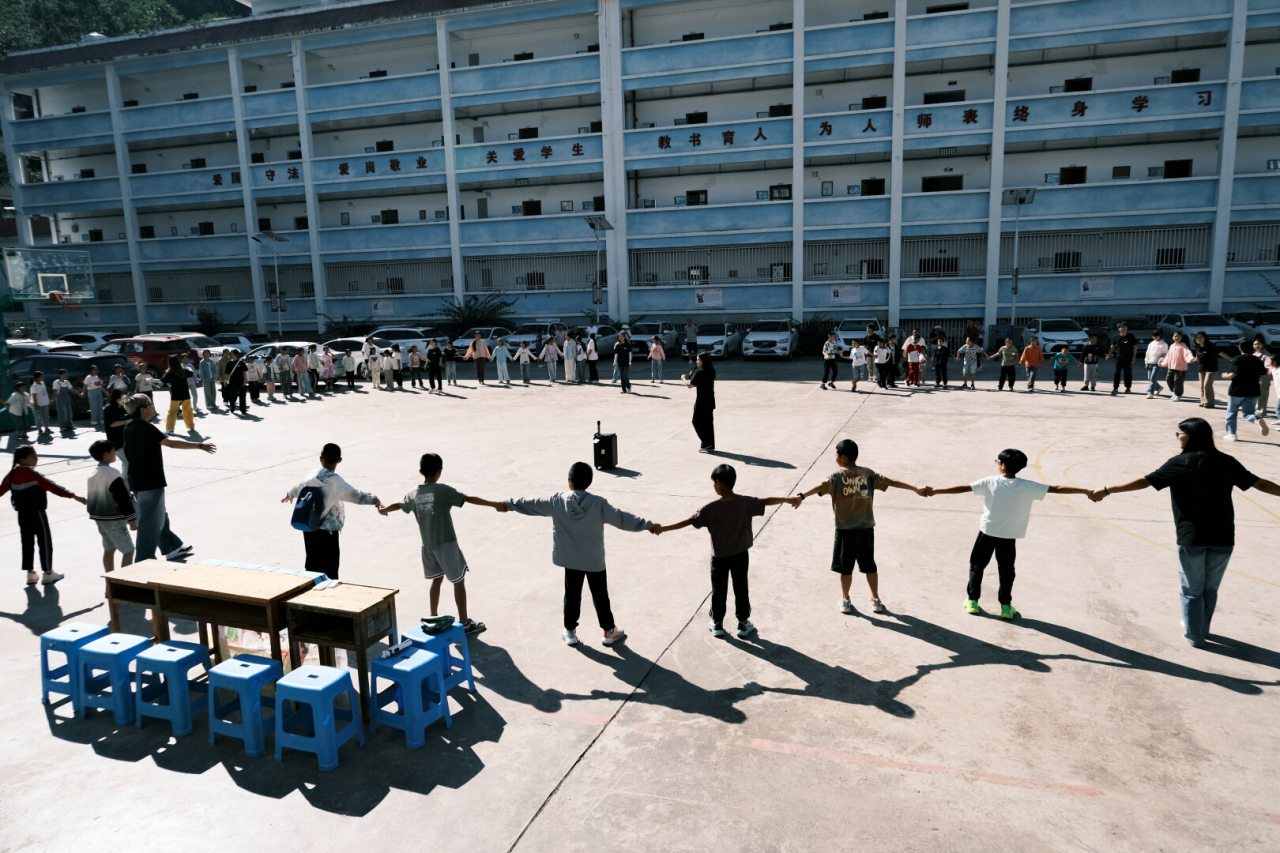 在文山壮族苗族自治州的校园操场,志愿者与各族孩子手拉手围成圈,这一圈,是民族同心圆的具象化。汉族、壮族、苗族的孩子紧紧相牵,用手臂勾勒出团结的轮廓,每一只手的相握,都是民族情谊的交融,筑牢中华民族共同体的青春根基。