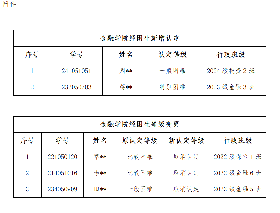 为认真做好我院家庭经济困难生认定工作,公平、公正、合理的分配资助资源,根据学工处关于学生资助工作的通知,经过学生申请、班级民主评议小组评议、学院认定工作组讨论等环节,新增认定了2位同学,变更认定了3位同学的等级,现将结果进行公示(见附件)。
