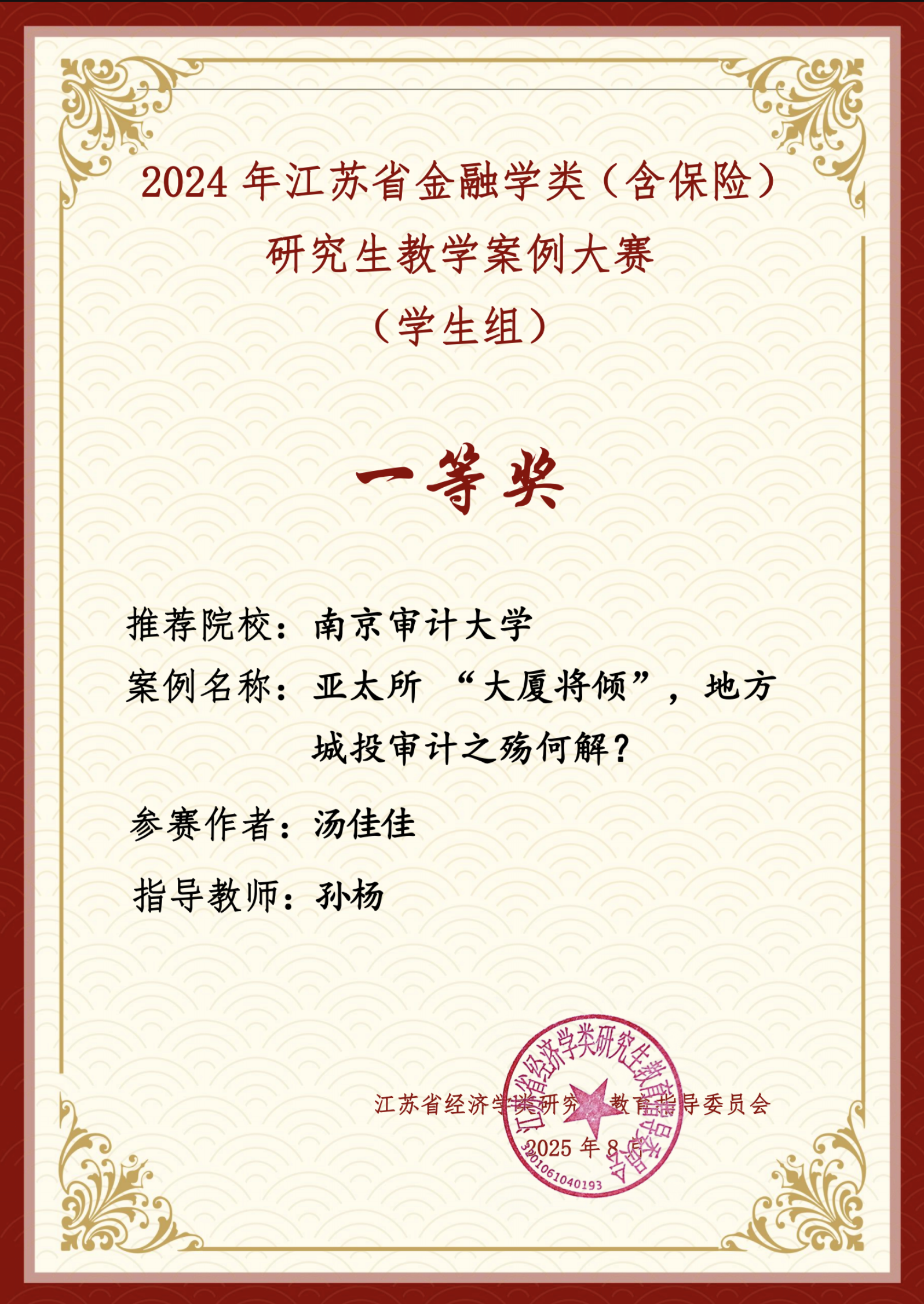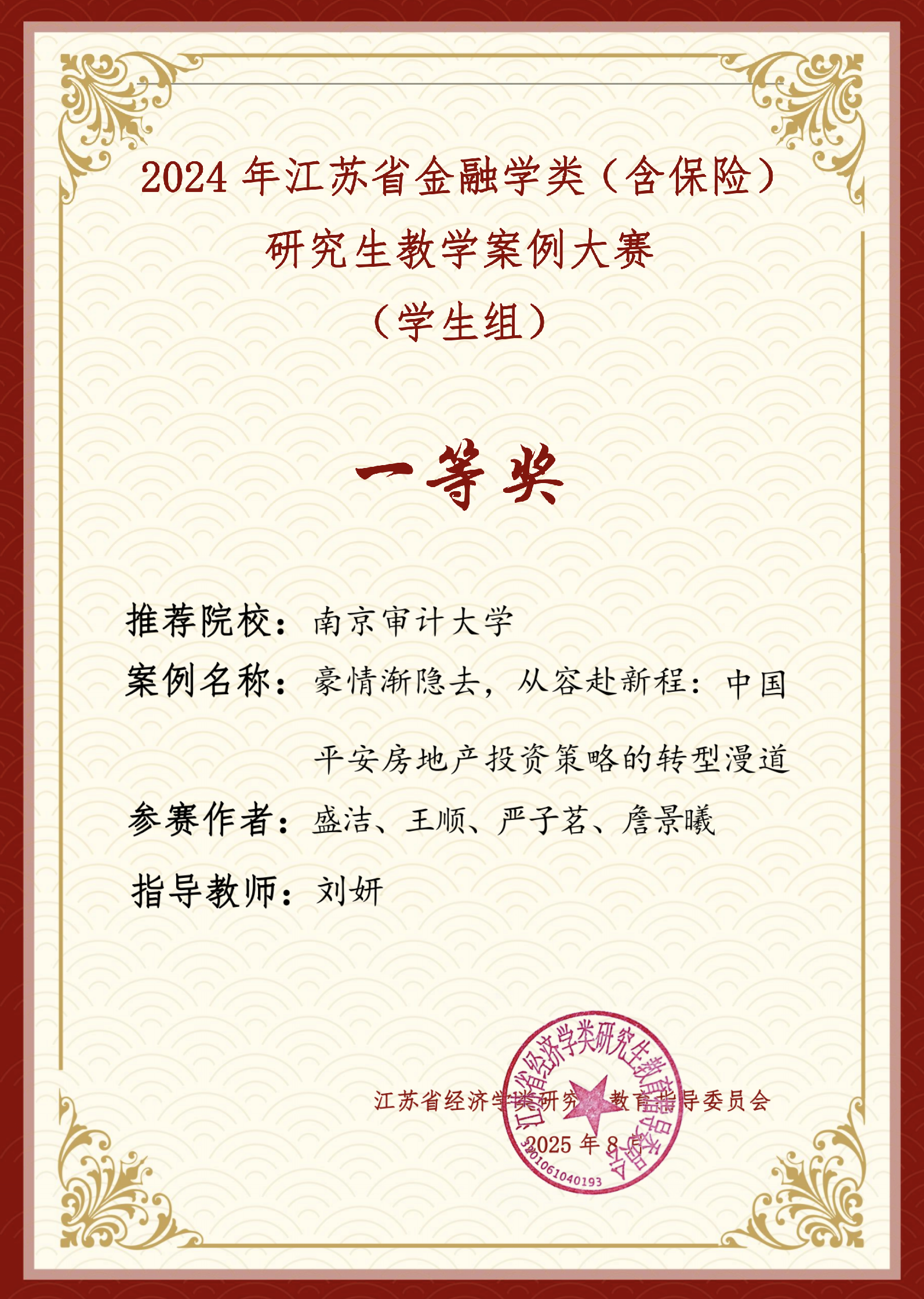 近日,江苏省经济学类研究生教育指导委员会公布了2024 年江苏省金融学类(含保险)研究生教学案例大赛(学生组)评审结果,我院9位研究生指导教师指导学生撰写的15篇案例在本次大赛中获奖,取得了不俗的成绩,其中:特等奖1项、一等奖2项、二等奖3项目、三等奖5项、优秀奖4项。卢亚娟教授指导的研究生李梦娴、李玲恩撰写的案例《紫气东来去悠悠,紫金宏图待重谋—探秘紫金农村商业银行的“褪色”与“蜕变”》获得案例大赛特等奖,孙杨教授指导的研究生汤佳佳撰写的案例《亚太所 “大厦将倾”,地方城投审计之殇何解?》与刘妍教授指导的研究生盛洁撰写的案例《豪情渐隐去,从容赴新程:中国平安房地产投资策略的转型漫道》分别获得案例大赛一等奖