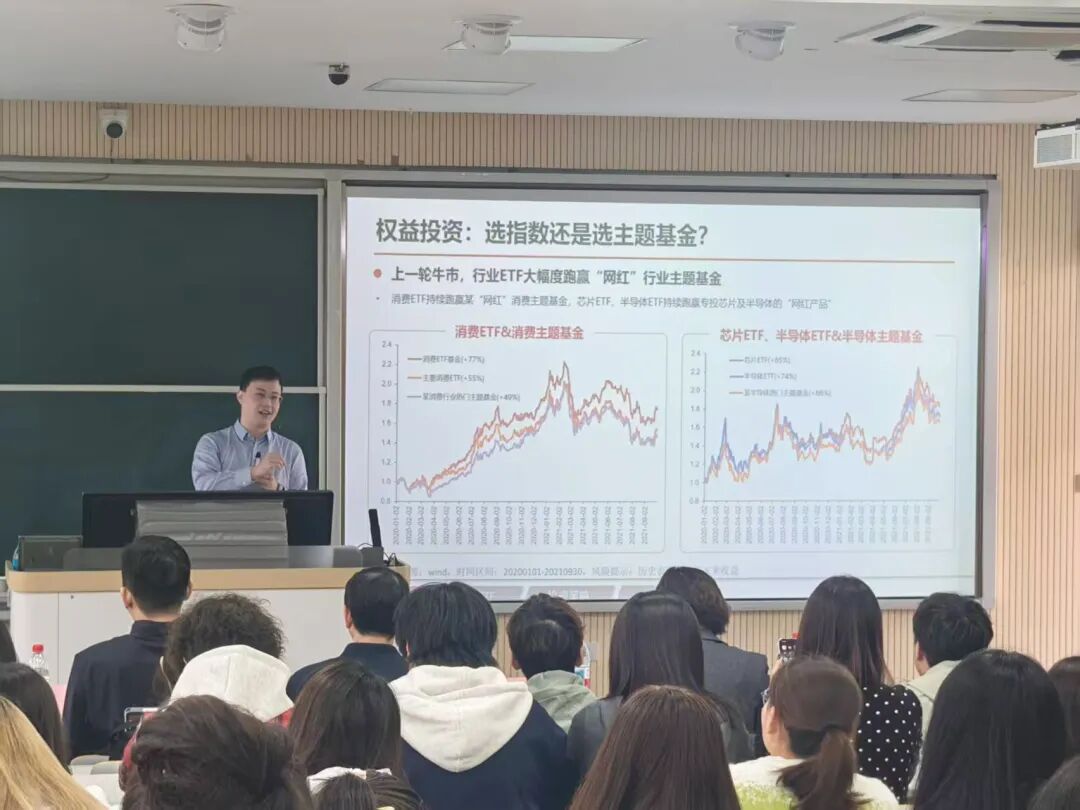 国泰基金量化投资部研究员韩飞扬博士为同学们带来了一场“ETF专业知识大讲堂”。他从机构投资者的视角出发,用通俗易懂的语言讲解了什么是ETE和指数,深刻阐述了ETF 是指数投资的首选工具,向大家展示了丰富的ETF产品线。他希望同学们珍惜此次“上海证券杯”比赛机会和平台,通过实践来更好把握知识,并提醒投资需践行长期、分散的理念,学会分批逢低布局。随后韩老师与现场同学进行互动交流,为同学们解答各类竞赛与投资相关问题。
