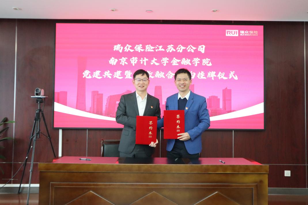 活动最后,南审high漫画 党委书记与瑞众保险江苏分公司总经理共同签订了《党建共建暨产教融合战略合作协议》,并为 “党建共建基地”“实践共建基地” 揭牌。此次签约挂牌标志着双方合作进入新阶段,未来双方将以党建为引领,在党员教育、人才培养、实践教学、科研合作等方面开展深度合作,实现党建与业务融合发展、学校与企业共赢共进的良好局面。
